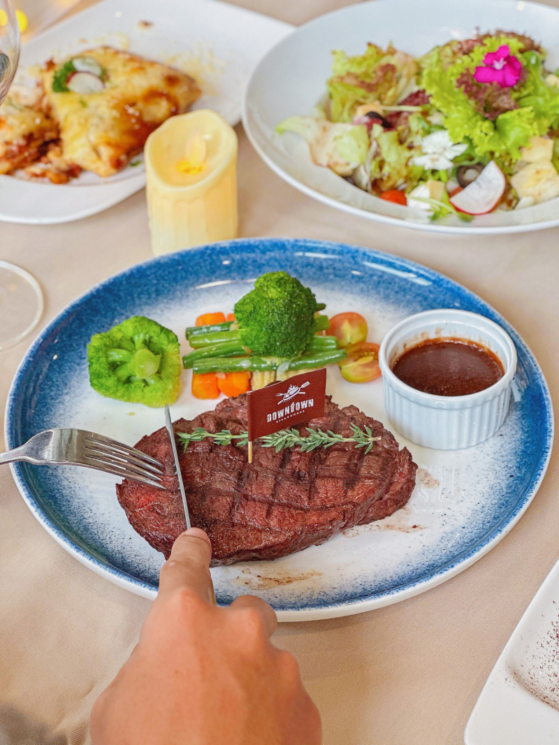 Downtown Steakhouse được biết đến với không gian sang trọng và thực đơn đa dạng, bao gồm nhiều món bò beefsteak hấp dẫn.